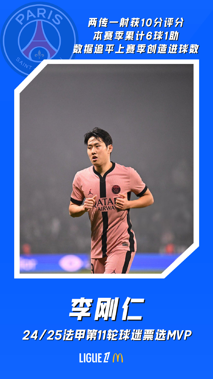 北京时间11月12日讯,据法甲官方,2024/25赛季法甲第11轮MVP为巴黎球员李刚仁。