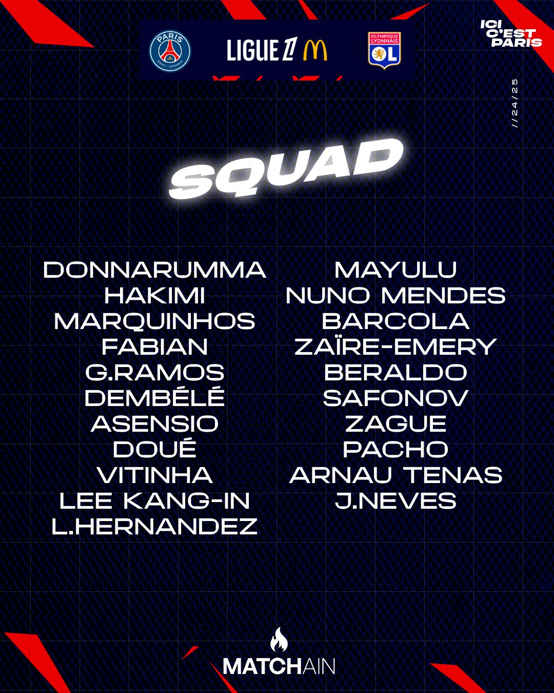雷速体育12月15日讯 巴黎公布了主场迎战里昂的大名单,其中科洛·穆阿尼无缘。