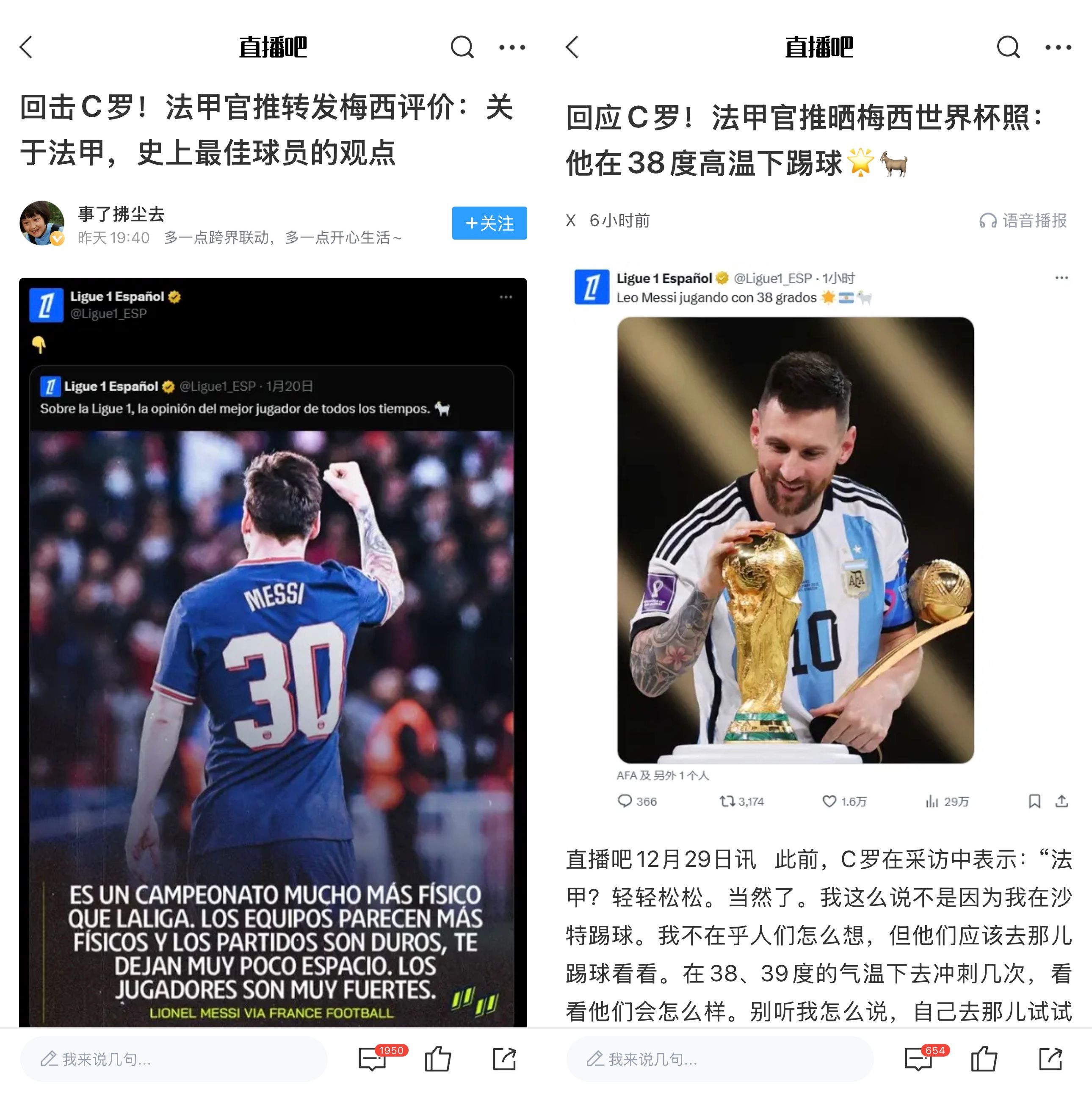 12月29日讯 昨日的环足颁奖典礼,C罗再次表示沙特联比法甲更好,并提到在沙特踢球时气温高达38、39度。法甲西语官推晒出梅西抚摸大力神杯的照片回击C罗:“梅西在38℃高温下踢球🌟🇦🇷🐐”